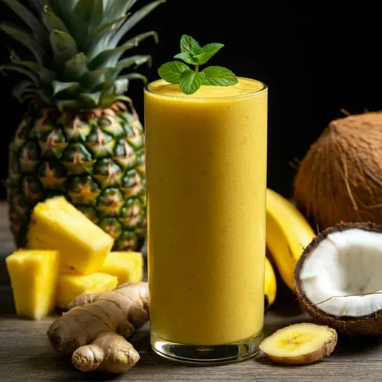 Blend until everything is silky-smooth. The bromelain in pineapple helps prevent bloating, while ginger soothes digestion.